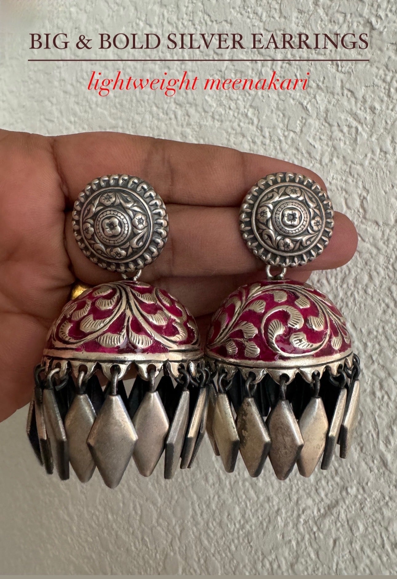 A pair of beautiful 92.5 purity Silver earrings with inlay Meenakari work.