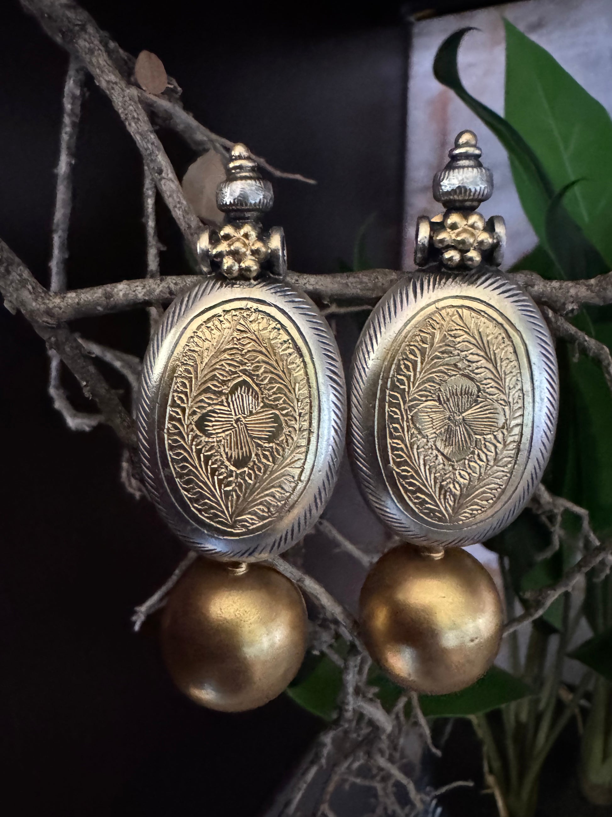 A pair of beautiful handmade Sterling Silver earrings polished in dual tone. A marriage between contemporary and traditional, it goes well with both sarees and Western outfits.