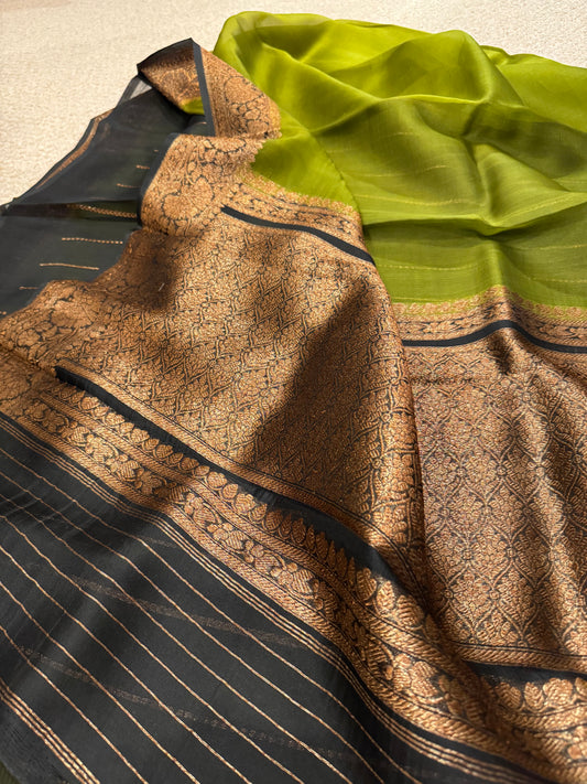 Handwoven Banarasi Kora ( organza ) silk saree- Mehendi